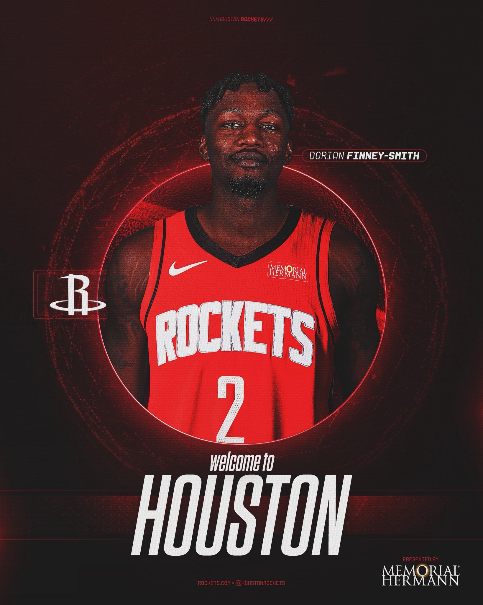 火箭官方一并发布了芬尼-史密斯身披火箭球衣的合成图,并表示欢迎他来到休斯顿,通过海报可以看到史密斯在火箭将身披2号球衣。